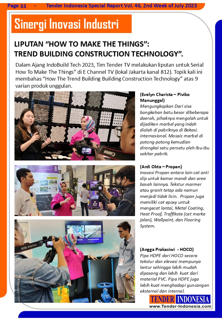 Dalam Ajang IndoBuild Tech 2023, Tim Tender TV melakukan liputan untuk Serial How To Make The Things” di E Channel TV (lokal Jakarta kanal 812). Topik kali ini membahas “How The Trend Building Building Construction Technology” atas 9 varian produk unggulan.