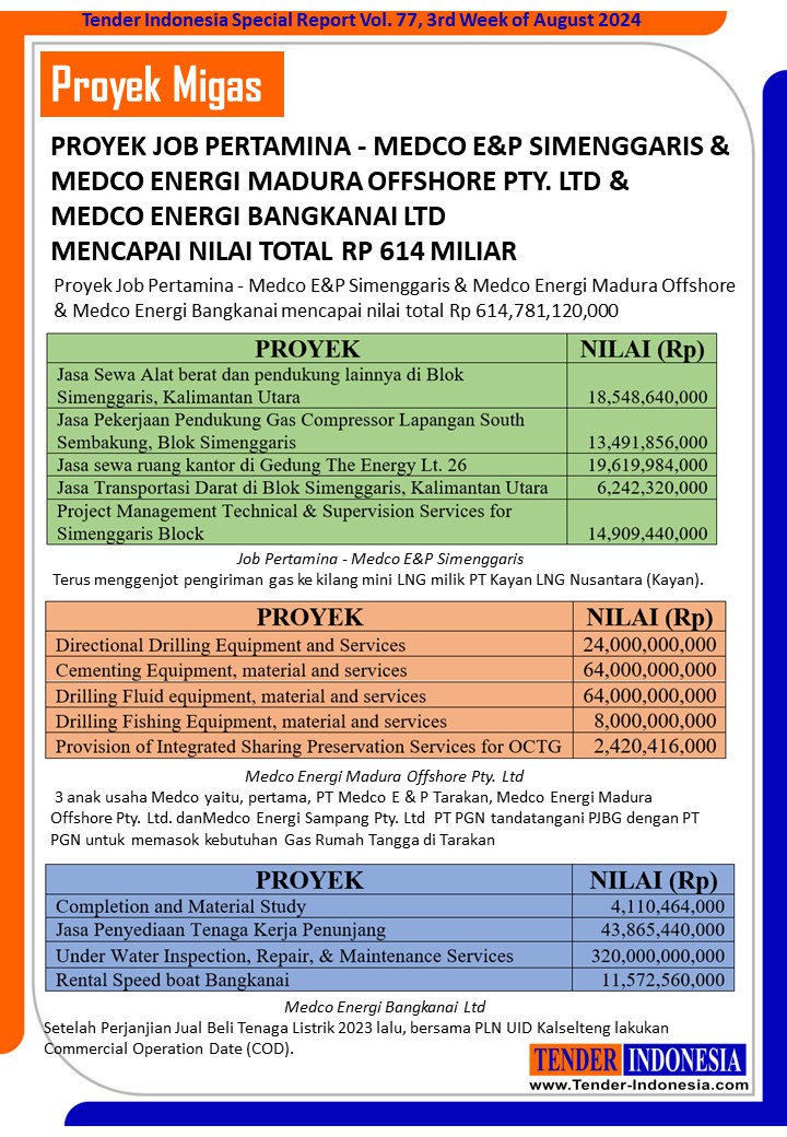 Proyek Job Pertamina - Medco E&P Simenggaris & Medco Energi Madura Offshore & Medco Energi Bangkanai mencapai nilai total Rp 614,781,120,000 terus menggenjot pengiriman gas ke kilang mini LNG milik PT Kayan LNG Nusantara (Kayan).