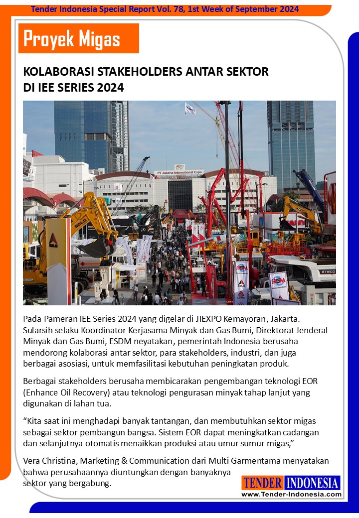 Pada Pameran IEE Series 2024 yang digelar di JIEXPO Kemayoran, Jakarta. Sularsih selaku Koordinator Kerjasama Minyak dan Gas Bumi, Direktorat Jenderal Minyak dan Gas Bumi, ESDM neyatakan, pemerintah Indonesia berusaha mendorong kolaborasi antar sektor, para stakeholders, industri, dan juga berbagai asosiasi, untuk memfasilitasi kebutuhan peningkatan produk.