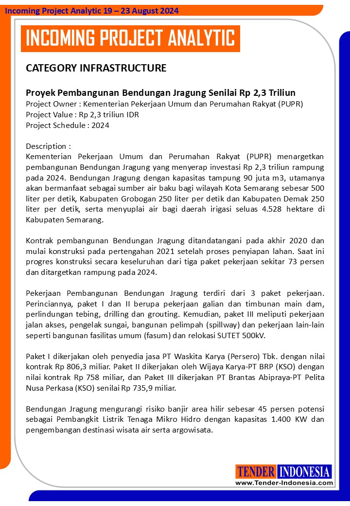 Description : Kementerian Pekerjaan Umum dan Perumahan Rakyat (PUPR) menargetkan pembangunan Bendungan Jragung yang menyerap investasi Rp 2,3 triliun rampung pada 2024. Bendungan Jragung dengan kapasitas tampung 90 juta m3, utamanya akan bermanfaat sebagai sumber air baku bagi wilayah Kota Semarang sebesar 500 liter per detik, Kabupaten Grobogan 250 liter per detik dan Kabupaten Demak 250 liter per detik, serta menyuplai air bagi daerah irigasi seluas 4.528 hektare di Kabupaten Semarang.