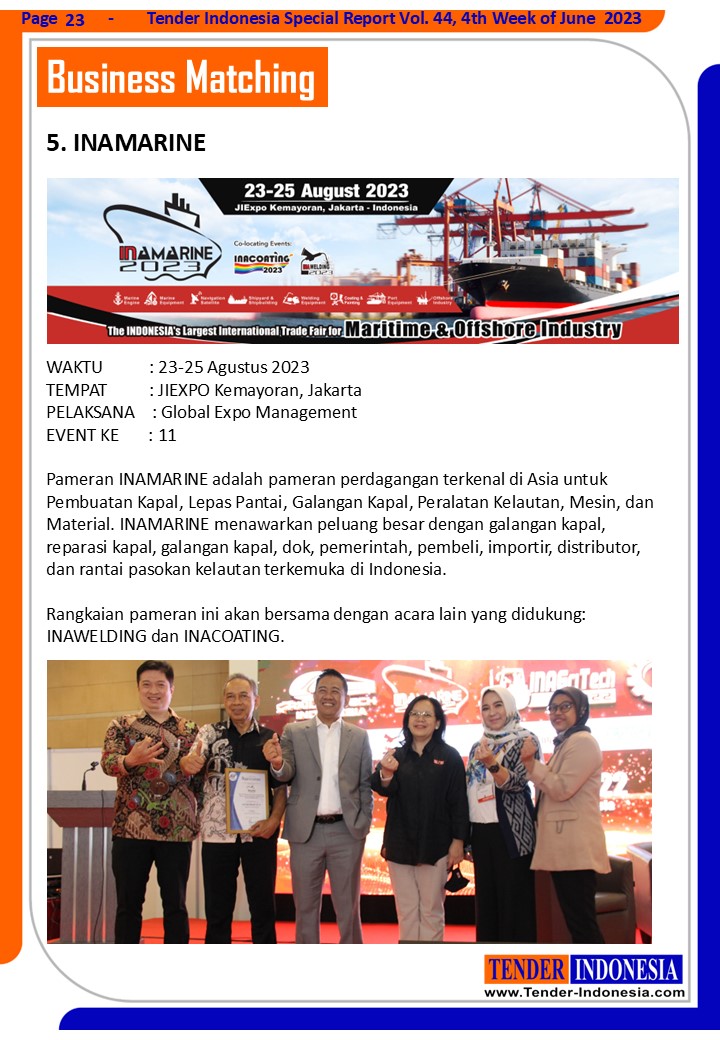 Pameran INAMARINE adalah pameran perdagangan terkenal di Asia untuk Pembuatan Kapal, Lepas Pantai, Galangan Kapal, Peralatan Kelautan, Mesin, dan Material. INAMARINE menawarkan peluang besar dengan galangan kapal, reparasi kapal, galangan kapal, dok, pemerintah, pembeli, importir, distributor, dan rantai pasokan kelautan terkemuka di Indonesia.