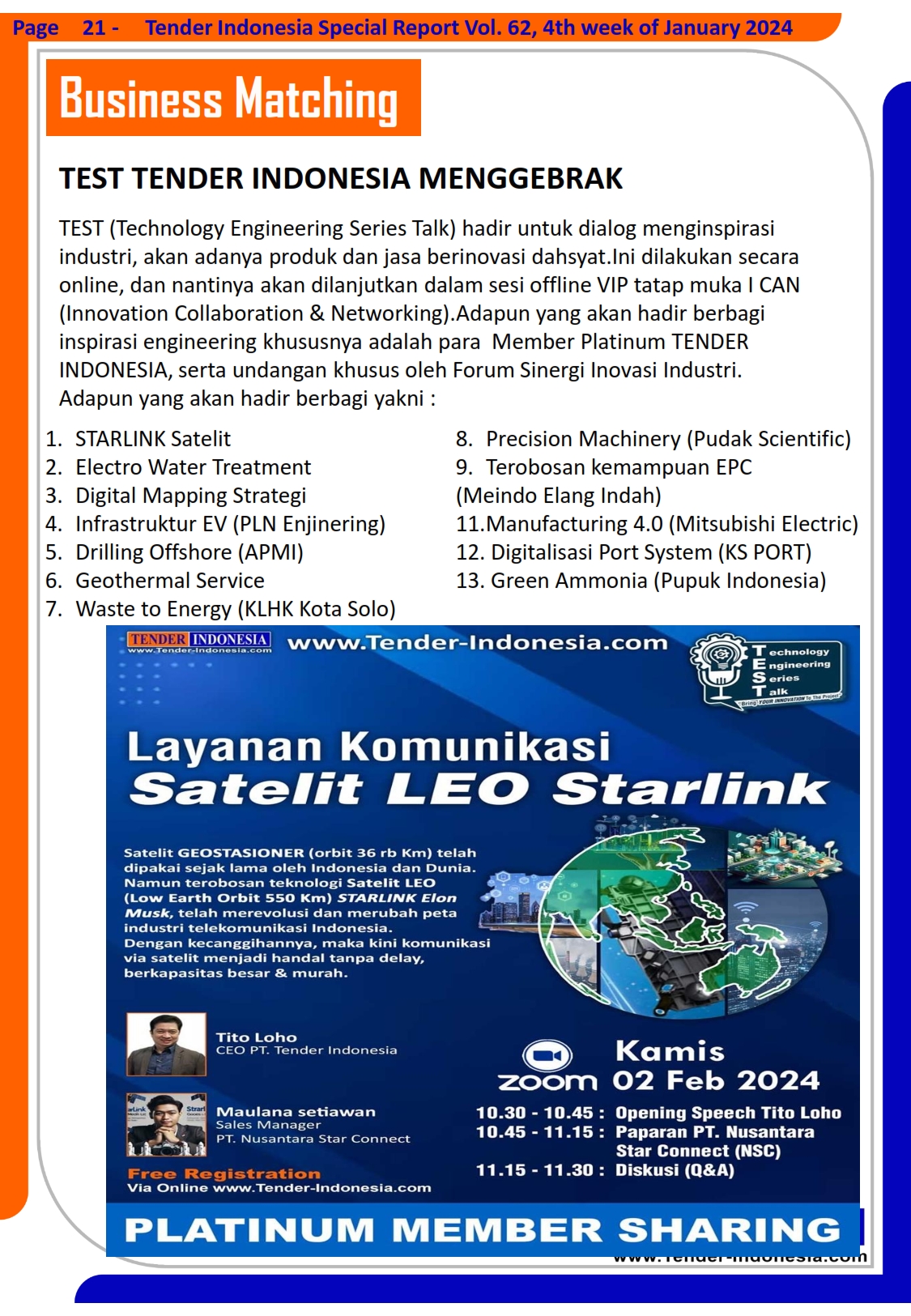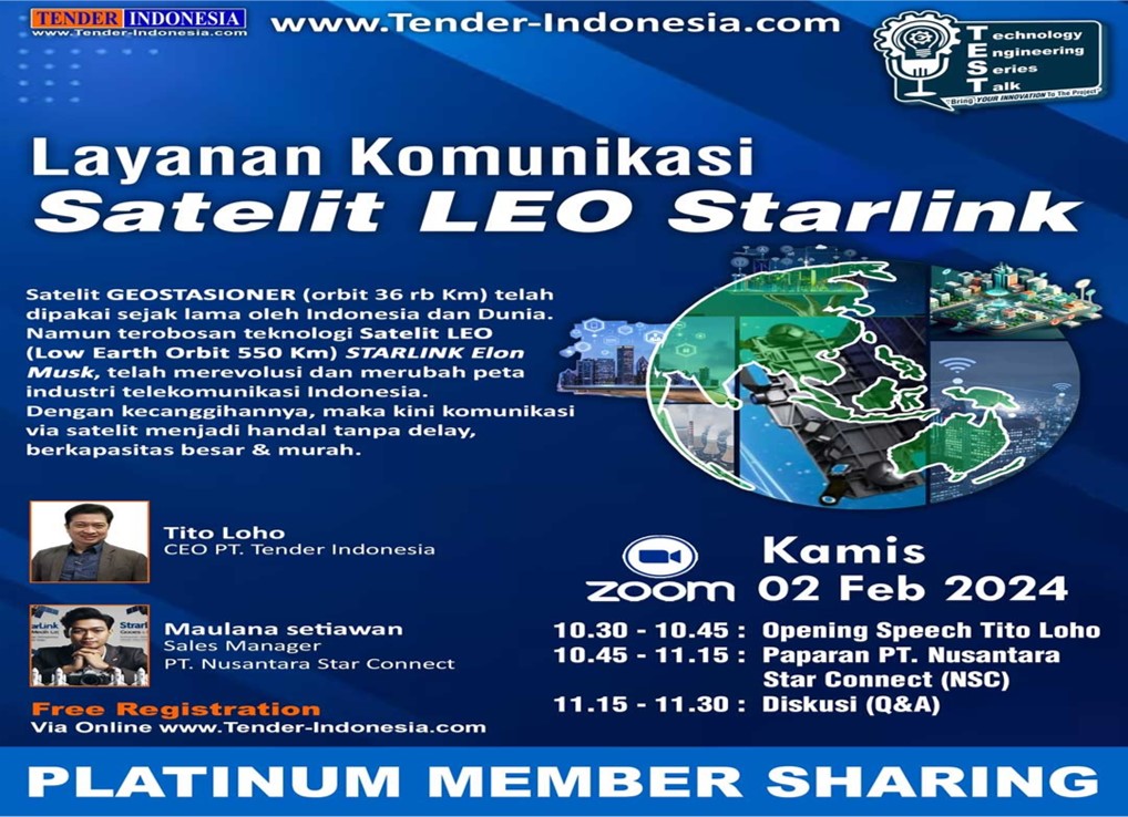 TEST (Technology Engineering Series Talk) hadir untuk dialog menginspirasi industri, akan adanya produk dan jasa berinovasi dahsyat.Ini dilakukan secara online, dan nantinya akan dilanjutkan dalam sesi offline VIP tatap muka I CAN (Innovation Collaboration & Networking). Adapun yang akan hadir berbagi inspirasi engineering khususnya adalah para Member Platinum TENDER INDONESIA, serta undangan khusus oleh Forum Sinergi Inovasi Industri. Adapun yang akan hadir berbagi yakni :
