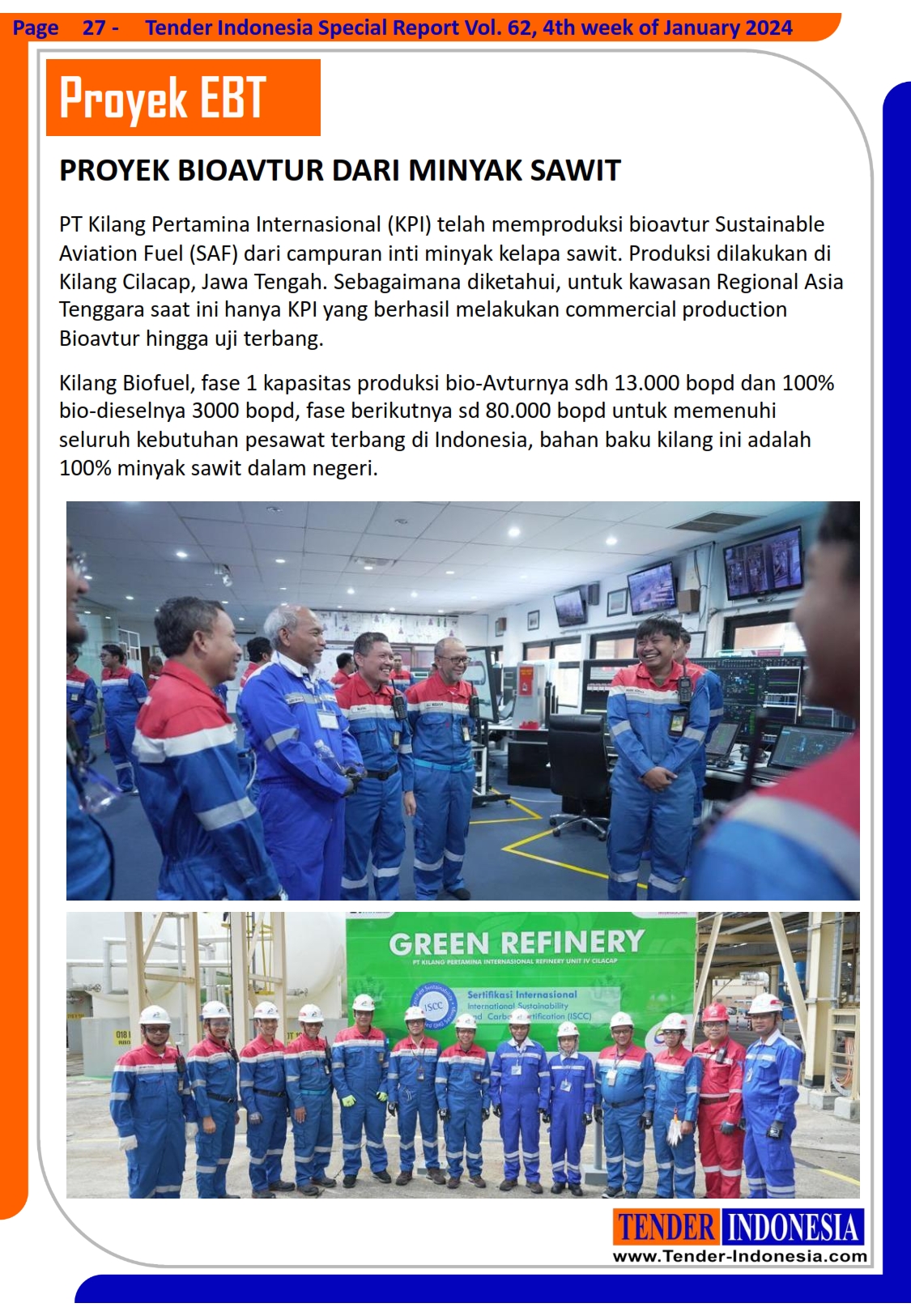 Kilang Biofuel, fase 1 kapasitas produksi bio-Avturnya sdh 13.000 bopd dan 100% bio-dieselnya 3000 bopd, fase berikutnya sd 80.000 bopd untuk memenuhi seluruh kebutuhan pesawat terbang di Indonesia, bahan baku kilang ini adalah 100% minyak sawit dalam negeri.