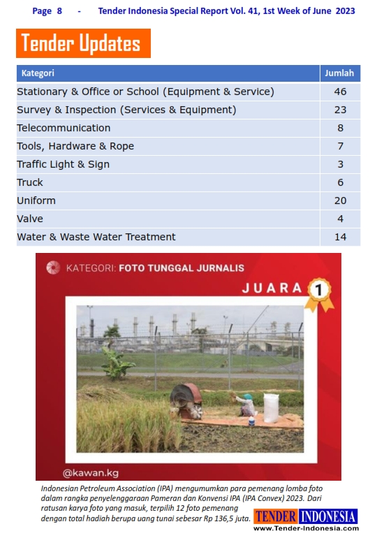 Indonesian Petroleum Association (IPA) mengumumkan para pemenang lomba foto dalam rangka penyelenggaraan Pameran dan Konvensi IPA (IPA Convex) 2023. Dari ratusan karya foto yang masuk, terpilih 12 foto pemenang dengan total hadiah berupa uang tunai sebesar Rp 136,5 juta.