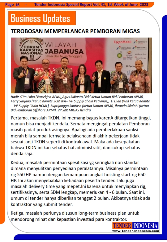 Pertama, masalah TKDN. Ini memang bagus karenA ditargetkan tinggi, namun bisa menjadi kendala. Semata mengingat peralatan Pemboran masih padat produk asingnya. Apalagi ada pemberlakuan sanksi merah bila sampai ternyata pelaksanaan di akhir pekerjaan tidak sesuai janji TKDN seperti di kontrak awal. Maka ada kesepakatan bahwa TKDN ini kan sebatas hal administratif, dan cukup sebatas denda saja.