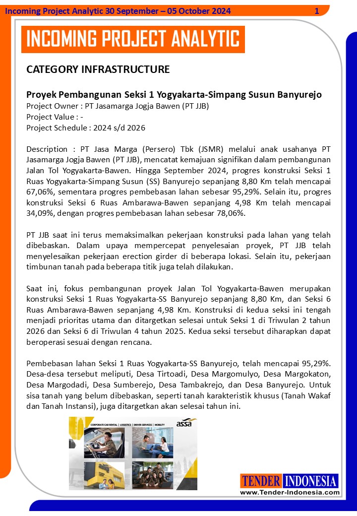 Description : PT Jasa Marga (Persero) Tbk (JSMR) melalui anak usahanya PT Jasamarga Jogja Bawen (PT JJB), mencatat kemajuan signifikan dalam pembangunan Jalan Tol Yogyakarta-Bawen. Hingga September 2024, progres konstruksi Seksi 1 Ruas Yogyakarta-Simpang Susun (SS) Banyurejo sepanjang 8,80 Km telah mencapai 67,06%, sementara progres pembebasan lahan sebesar 95,29%. Selain itu, progres konstruksi Seksi 6 Ruas Ambarawa-Bawen sepanjang 4,98 Km telah mencapai 34,09%, dengan progres pembebasan lahan sebesar 78,06%.