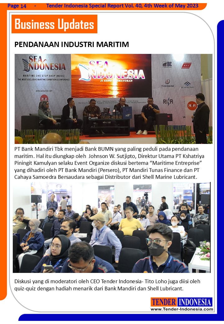 PT Bank Mandiri Tbk menjadi Bank BUMN yang paling peduli pada pendanaan maritim. Hal itu diungkap oleh Johnson W. Sutjipto, Direktur Utama PT Kshatriya Piningit Kamulyan selaku Event Organize diskusi bertema “Maritime Entreprise” yang dihadiri oleh PT Bank Mandiri (Persero), PT Mandiri Tunas Finance dan PT Cahaya Samoedra Bersaudara sebagai Distributor dari Shell Marine Lubricant.