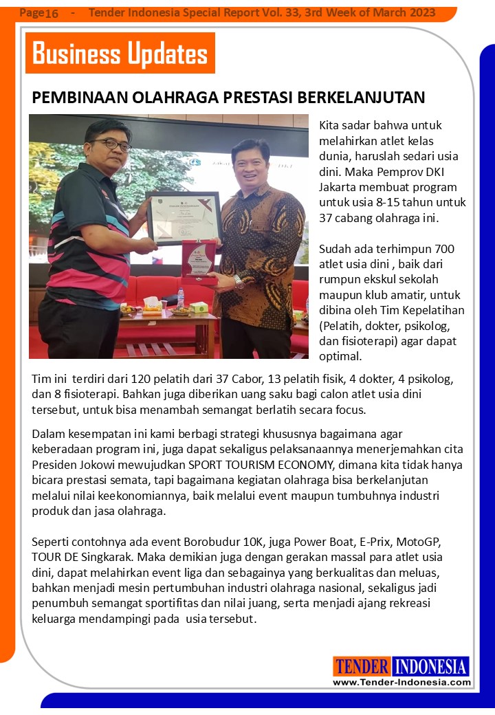 Dalam kesempatan ini kami berbagi strategi khususnya bagaimana agar keberadaan program ini, juga dapat sekaligus pelaksanaannya menerjemahkan cita Presiden Jokowi mewujudkan SPORT TOURISM ECONOMY, dimana kita tidak hanya bicara prestasi semata, tapi bagaimana kegiatan olahraga bisa berkelanjutan melalui nilai keekonomiannya, baik melalui event maupun tumbuhnya industri produk dan jasa olahraga.