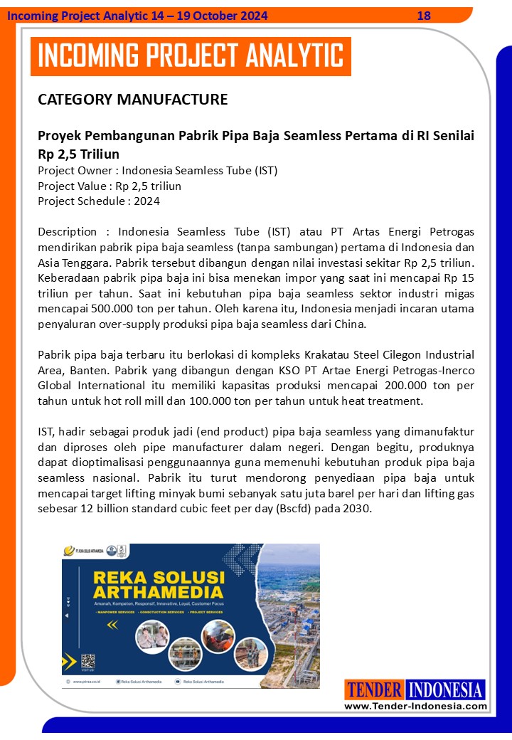 Project Owner : Indonesia Seamless Tube (IST) Project Value : Rp 2,5 triliun Project Schedule : 2024