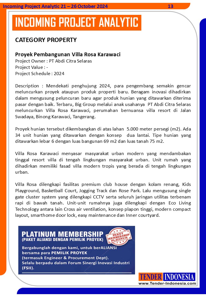 Description : Mendekati penghujung 2024, para pengembang semakin gencar meluncurkan proyek ataupun produk properti baru. Beragam inovasi dihadirkan dalam mengusung peluncuran baru agar produk hunian yang ditawarkan diterima pasar dengan baik. Terbaru, Big Group melalui anak usahanya PT Abdi Citra Selaras meluncurkan Villa Rosa Karawaci, perumahan bernuansa villa resort di Jalan Swadaya, Binong Karawaci, Tangerang.