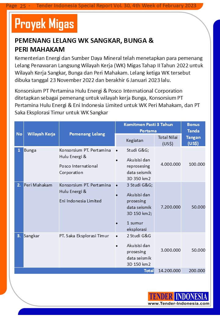 Kementerian Energi dan Sumber Daya Mineral telah menetapkan para pemenang Lelang Penawaran Langsung Wilayah Kerja (WK) Migas Tahap II Tahun 2022 untuk Wilayah Kerja Sangkar, Bunga dan Peri Mahakam. Lelang ketiga WK tersebut dibuka tanggal 23 November 2022 dan berakhir 6 Januari 2023 lalu. Konsorsium PT Pertamina Hulu Energi & Posco International Corporation ditetapkan sebagai pemenang untuk wilayah kerja Bunga, Konsorsium PT Pertamina Hulu Energi & Eni Indonesia Limited untuk WK Peri Mahakam, dan PT Saka Eksplorasi Timur untuk WK Sangkar