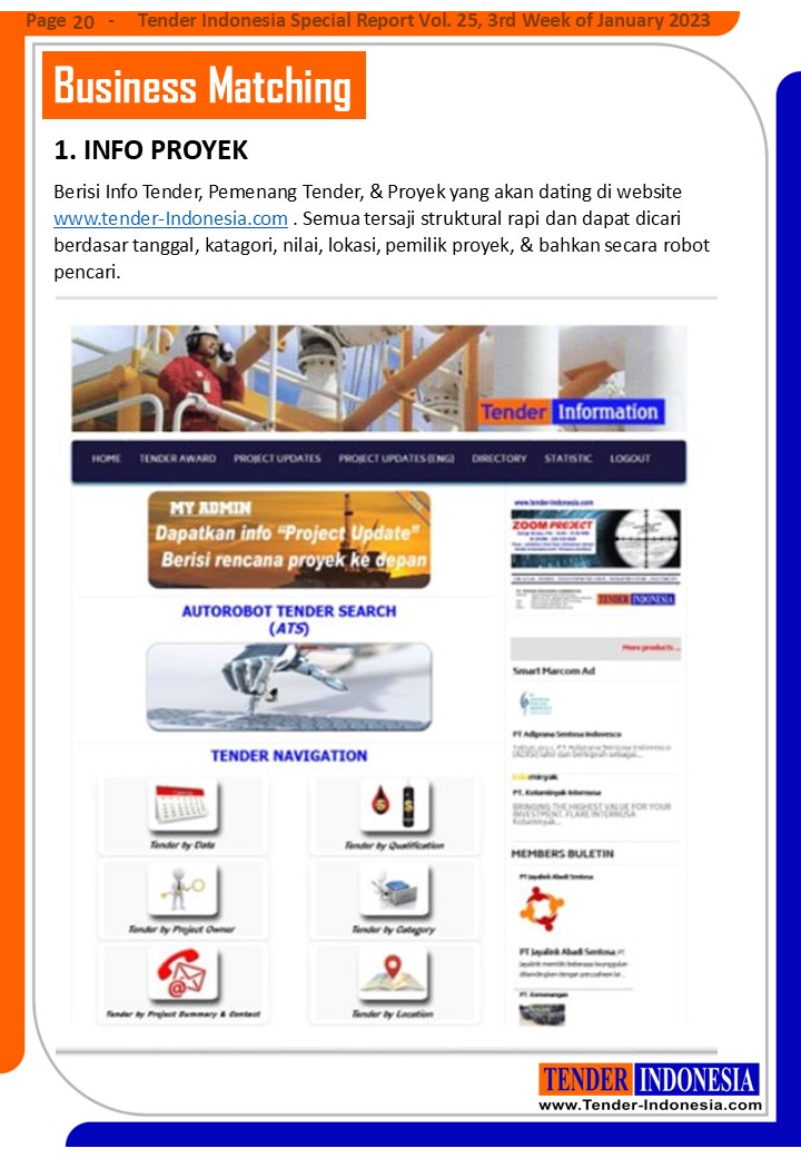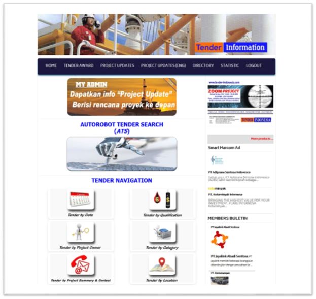 Berisi Info Tender, Pemenang Tender, & Proyek yang akan dating di website www.tender-Indonesia.com . Semua tersaji struktural rapi dan dapat dicari berdasar tanggal, katagori, nilai, lokasi, pemilik proyek, & bahkan secara robot pencari.