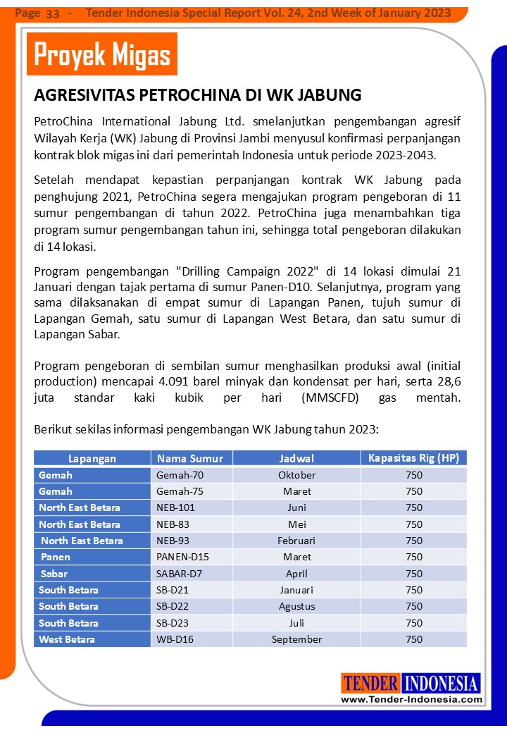 PetroChina International Jabung Ltd. smelanjutkan pengembangan agresif Wilayah Kerja (WK) Jabung di Provinsi Jambi menyusul konfirmasi perpanjangan kontrak blok migas ini dari pemerintah Indonesia untuk periode 2023-2043. Setelah mendapat kepastian perpanjangan kontrak WK Jabung pada penghujung 2021, PetroChina segera mengajukan program pengeboran di 11 sumur pengembangan di tahun 2022. PetroChina juga menambahkan tiga program sumur pengembangan tahun ini, sehingga total pengeboran dilakukan di 14 lokasi. Program pengembangan "Drilling Campaign 2022" di 14 lokasi dimulai 21 Januari dengan tajak pertama di sumur Panen-D10. Selanjutnya, program yang sama dilaksanakan di empat sumur di Lapangan Panen, tujuh sumur di Lapangan Gemah, satu sumur di Lapangan West Betara, dan satu sumur di Lapangan Sabar.