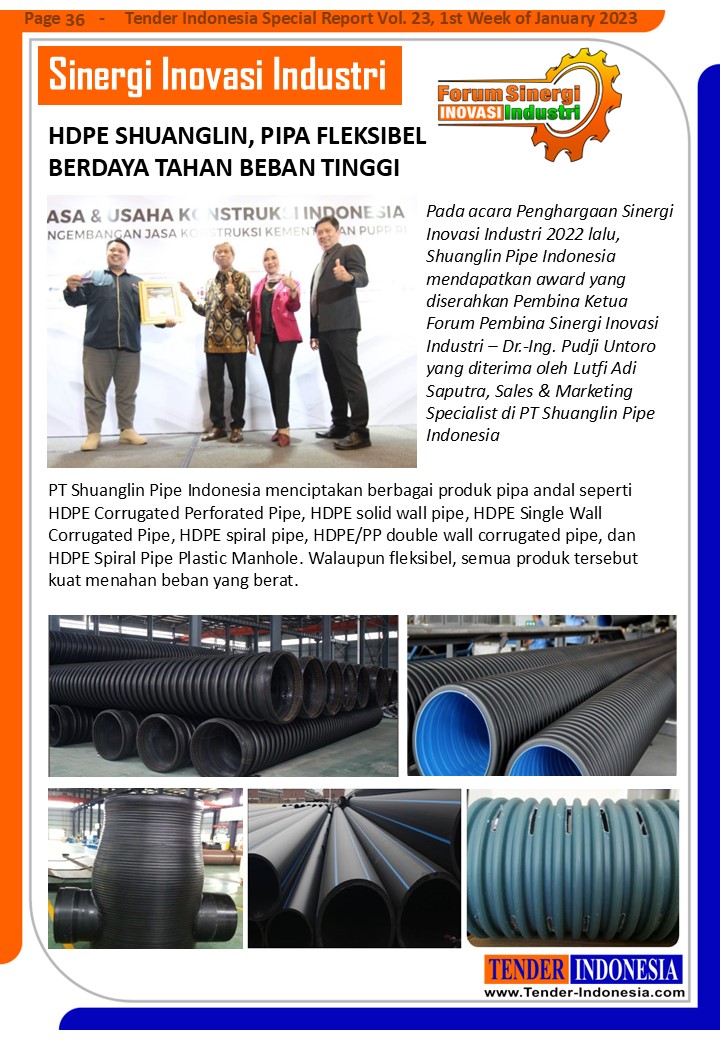 Pada acara Penghargaan Sinergi Inovasi Industri 2022 lalu, Shuanglin Pipe Indonesia mendapatkan award yang diserahkan Pembina Ketua Forum Pembina Sinergi Inovasi Industri – Dr.-Ing. Pudji Untoro yang diterima oleh Lutfi Adi Saputra, Sales & Marketing Specialist di PT Shuanglin Pipe Indonesia