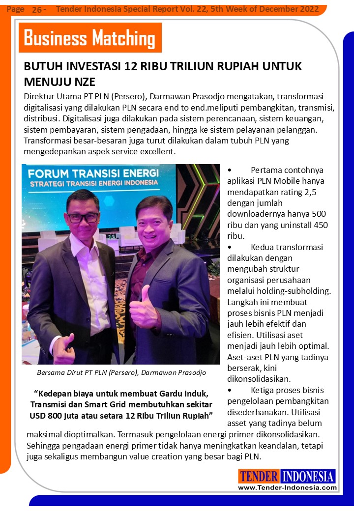 Direktur Utama PT PLN (Persero), Darmawan Prasodjo mengatakan, transformasi digitalisasi yang dilakukan PLN secara end to end.meliputi pembangkitan, transmisi, distribusi. Digitalisasi juga dilakukan pada sistem perencanaan, sistem keuangan, sistem pembayaran, sistem pengadaan, hingga ke sistem pelayanan pelanggan. Transformasi besar-besaran juga turut dilakukan dalam tubuh PLN yang mengedepankan aspek service excellent. • Pertama contohnya aplikasi PLN Mobile hanya mendapatkan rating 2,5 dengan jumlah downloadernya hanya 500 ribu dan yang uninstall 450 ribu. • Kedua transformasi dilakukan dengan mengubah struktur organisasi perusahaan melalui holding-subholding. Langkah ini membuat proses bisnis PLN menjadi jauh lebih efektif dan efisien. Utilisasi aset menjadi jauh lebih optimal. Aset-aset PLN yang tadinya berserak, kini dikonsolidasikan. • Ketiga proses bisnis pengelolaan pembangkitan disederhanakan. Utilisasi asset yang tadinya belum