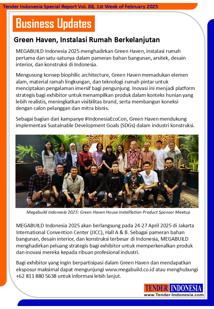 Sebagai bagian dari kampanye #IndonesiaEcoCon, Green Haven mendukung implementasi Sustainable Development Goals (SDGs) dalam industri konstruksi. MEGABUILD Indonesia 2025 akan berlangsung pada 24-27 April 2025 di Jakarta International Convention Center (JICC), Hall A & B. Sebagai pameran bahan bangunan, desain interior, dan konstruksi terbesar di Indonesia, MEGABUILD menghadirkan peluang strategis bagi exhibitor untuk memperkenalkan produk dan inovasi mereka kepada ribuan profesional industri.