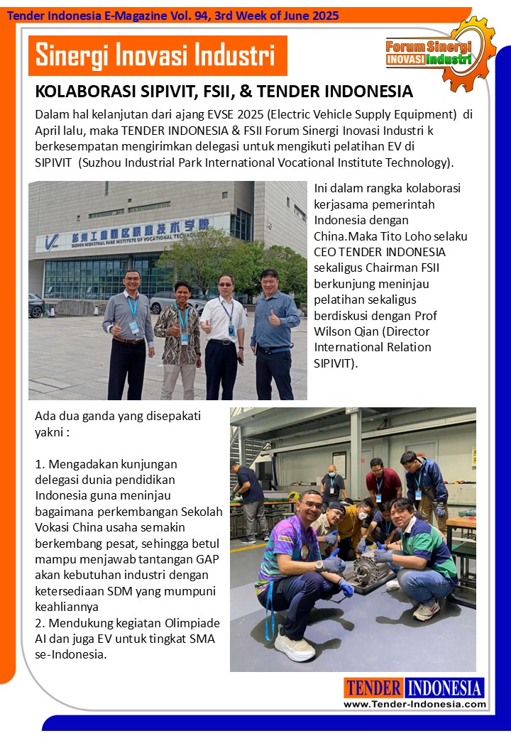Dalam hal kelanjutan dari ajang EVSE 2025 (Electric Vehicle Supply Equipment) di April lalu, maka TENDER INDONESIA & FSII Forum Sinergi Inovasi Industri k berkesempatan mengirimkan delegasi untuk mengikuti pelatihan EV di SIPIVIT (Suzhou Industrial Park International Vocational Institute Technology).