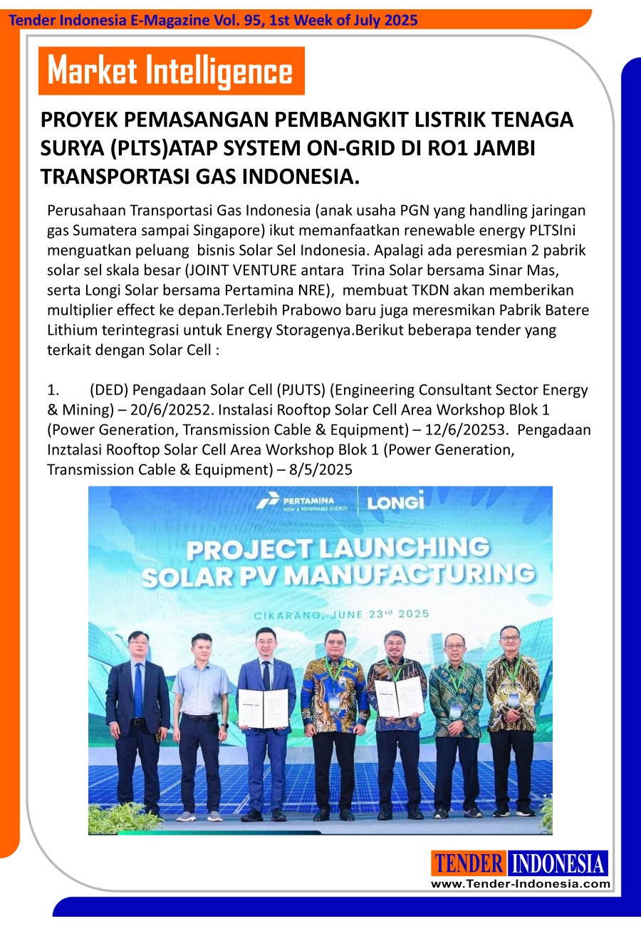 Perusahaan Transportasi Gas Indonesia (anak usaha PGN yang handling jaringan gas Sumatera sampai Singapore) ikut memanfaatkan renewable energy PLTSIni menguatkan peluang bisnis Solar Sel Indonesia. Apalagi ada peresmian 2 pabrik solar sel skala besar (JOINT VENTURE antara Trina Solar bersama Sinar Mas, serta Longi Solar bersama Pertamina NRE), membuat TKDN akan memberikan multiplier effect ke depan.Terlebih Prabowo baru juga meresmikan Pabrik Batere Lithium terintegrasi untuk Energy Storagenya.Berikut beberapa tender yang terkait dengan Solar Cell :