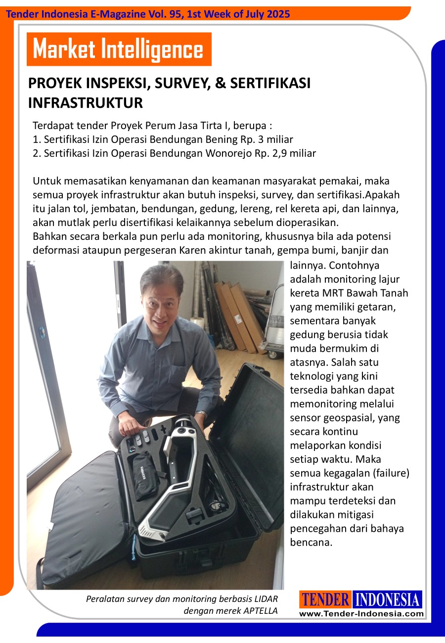 Terdapat tender Proyek Perum Jasa Tirta I, berupa : 1. Sertifikasi Izin Operasi Bendungan Bening Rp. 3 miliar 2. Sertifikasi Izin Operasi Bendungan Wonorejo Rp. 2,9 miliar