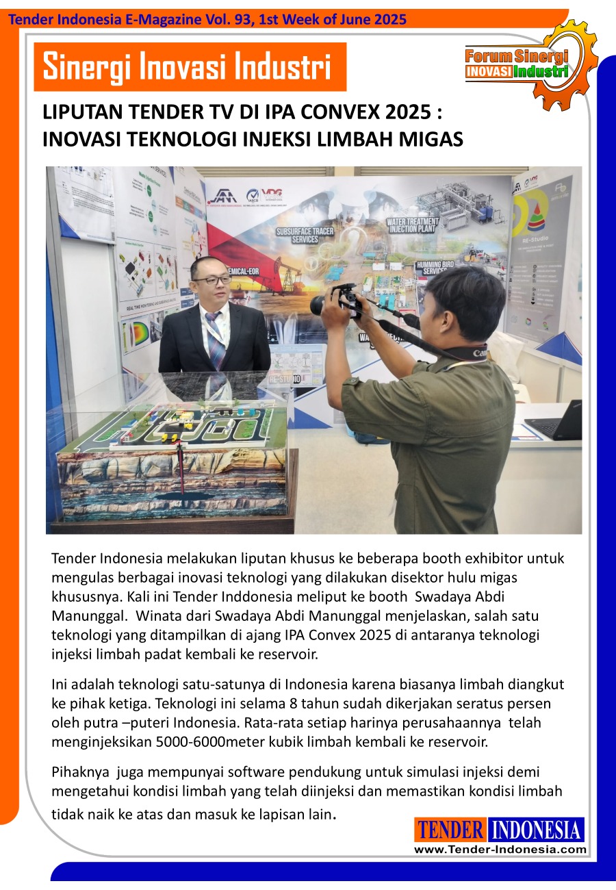 Tender Indonesia melakukan liputan khusus ke beberapa booth exhibitor untuk mengulas berbagai inovasi teknologi yang dilakukan disektor hulu migas khususnya. Kali ini Tender Inddonesia meliput ke booth Swadaya Abdi Manunggal. Winata dari Swadaya Abdi Manunggal menjelaskan, salah satu teknologi yang ditampilkan di ajang IPA Convex 2025 di antaranya teknologi injeksi limbah padat kembali ke reservoir.