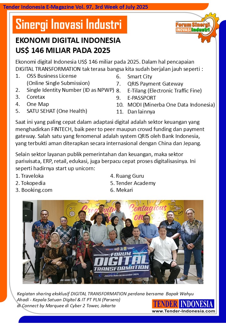 Ekonomi digital Indonesia US$ 146 miliar pada 2025. Dalam hal pencapaian DIGITAL TRANSFORMATION tak terasa bangsa kita sudah berjalan jauh seperti : 1.OSS Business License (Online Single Submission) 2.Single Identity Number (ID as NPWP) 3.Coretax 4.One Map
