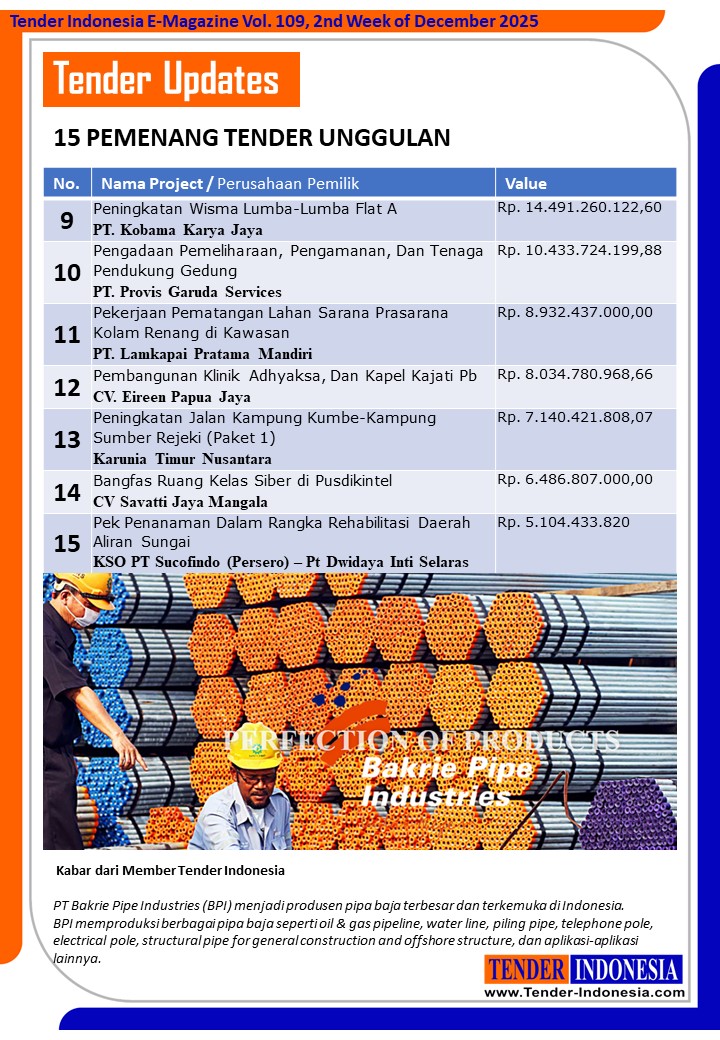 PT Bakrie Pipe Industries (BPI) menjadi produsen pipa baja terbesar dan terkemuka di Indonesia. BPI memproduksi berbagai pipa baja seperti oil & gas pipeline, water line, piling pipe, telephone pole, electrical pole, structural pipe for general construction and offshore structure, dan aplikasi-aplikasi lainnya.