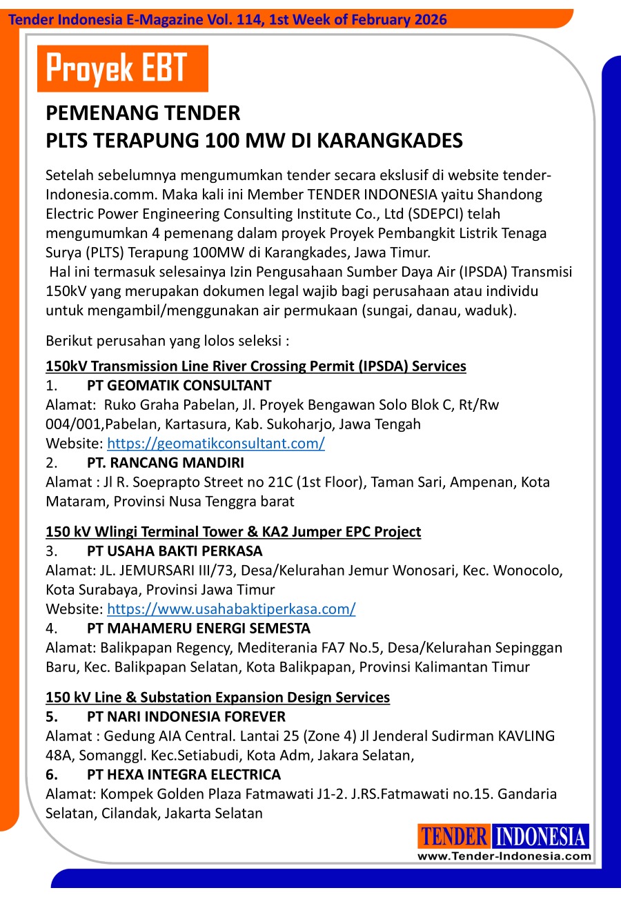 Setelah sebelumnya mengumumkan tender secara ekslusif di website tender-Indonesia.comm. Maka kali ini Member TENDER INDONESIA yaitu Shandong Electric Power Engineering Consulting Institute Co., Ltd (SDEPCI) telah mengumumkan 4 pemenang dalam proyek Proyek Pembangkit Listrik Tenaga Surya (PLTS) Terapung 100MW di Karangkades, Jawa Timur. Hal ini termasuk selesainya Izin Pengusahaan Sumber Daya Air (IPSDA) Transmisi 150kV yang merupakan dokumen legal wajib bagi perusahaan atau individu untuk mengambil/menggunakan air permukaan (sungai, danau, waduk).