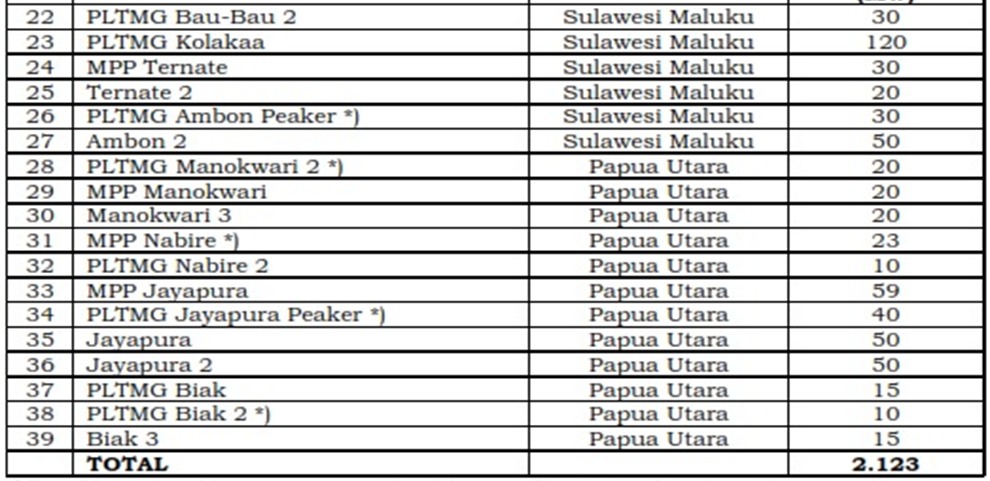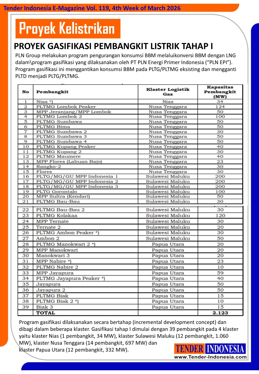 Program gasifikasi dilaksanakan secara bertahap (incremental development concept) dan dibagi dalam beberapa klaster. Gasifikasi tahap I dimulai dengan 39 pembangkit pada 4 klaster yaitu klaster Nias (1 pembangkit, 34 MW), klaster Sulawesi Maluku (12 pembangkit, 1.060 MW), klaster Nusa Tenggara (14 pembangkit, 697 MW) dan klaster Papua Utara (12 pembangkit, 332 MW).