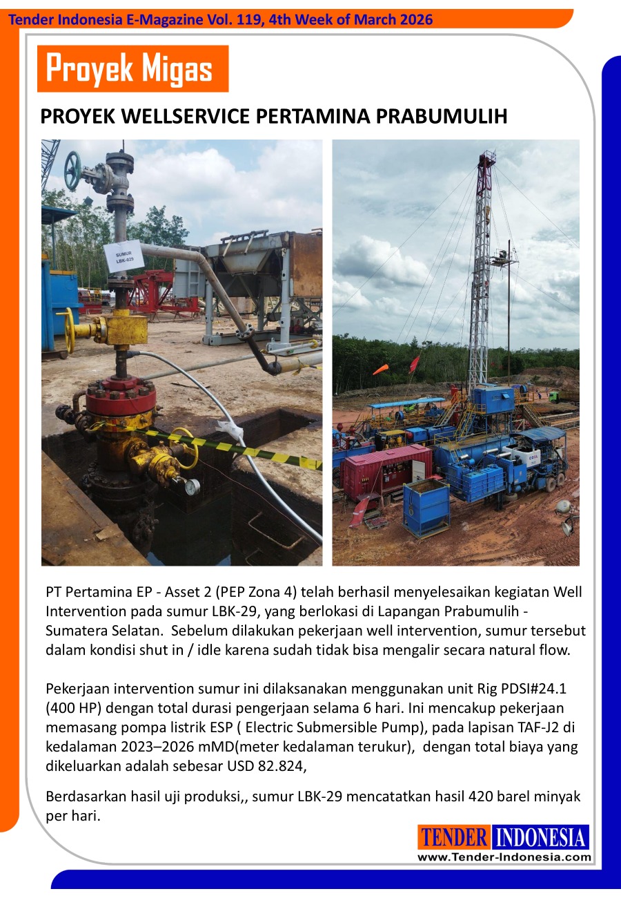 PT Pertamina EP - Asset 2 (PEP Zona 4) telah berhasil menyelesaikan kegiatan Well Intervention pada sumur LBK-29, yang berlokasi di Lapangan Prabumulih - Sumatera Selatan. Sebelum dilakukan pekerjaan well intervention, sumur tersebut dalam kondisi shut in / idle karena sudah tidak bisa mengalir secara natural flow.