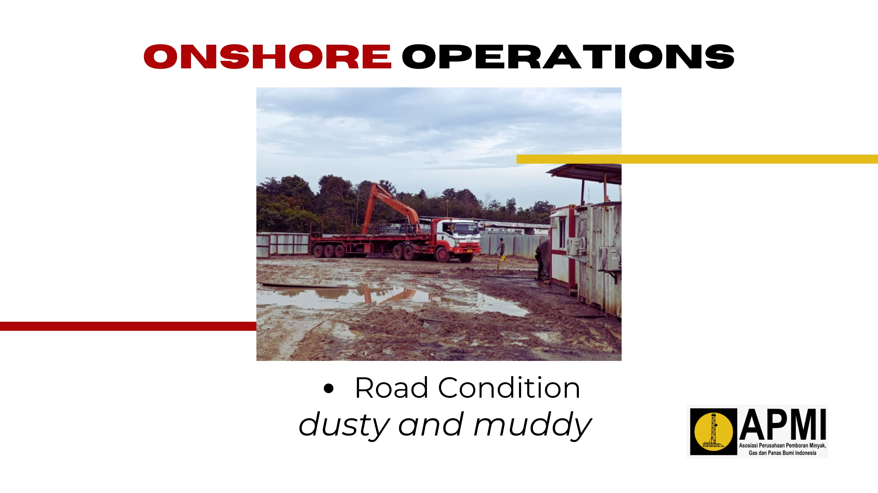 Sebab misalnya dari sisi infrastruktur maka di onshore bisa lebih sulit karena akses jalannya tidak semuanya sudah tersedia. Terlebih peralatan yang harus diangkut mencapai beban 2-35 ton sebanyak 180 kali pengangkutan. Jadi para kontraktor migas harus mempertimbangkan beban angkutan agar tidak rusak ataupun membuat jalanan baru untuk akses peralatan ke proyek. Hal ini menyebabkan perlunya menambah anggaran untuk membuat infrastruktur baru.