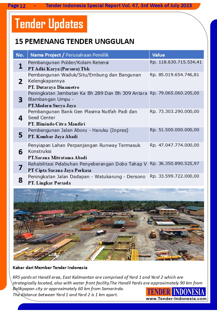 KRS yards at Handil area, East Kalimantan are comprised of Yard 1 and Yard 2 which are strategically located, also with water front facility.The Handil Yards are approximately 90 km from Balikpapan city or approximately 60 km from Samarinda. The distance between Yard 1 and Yard 2 is 1 km apart.