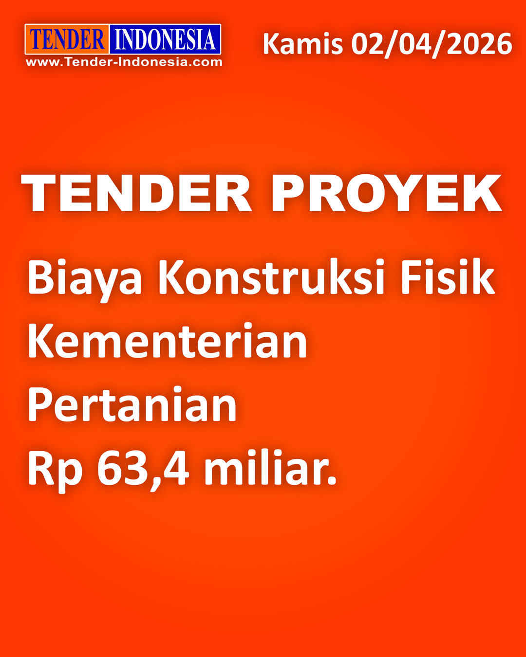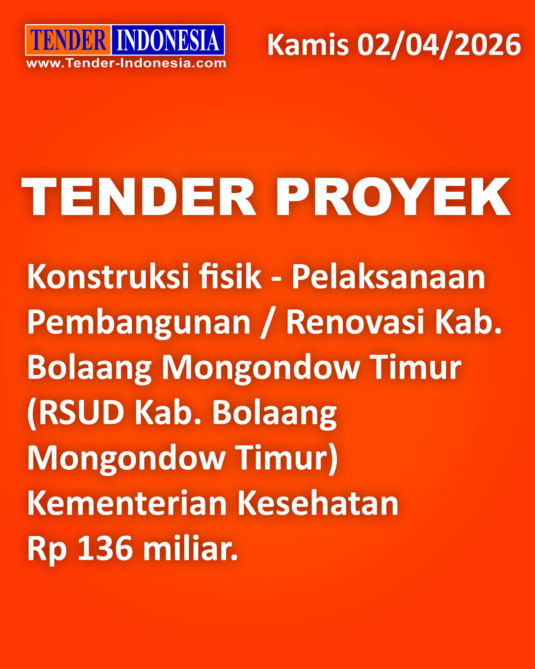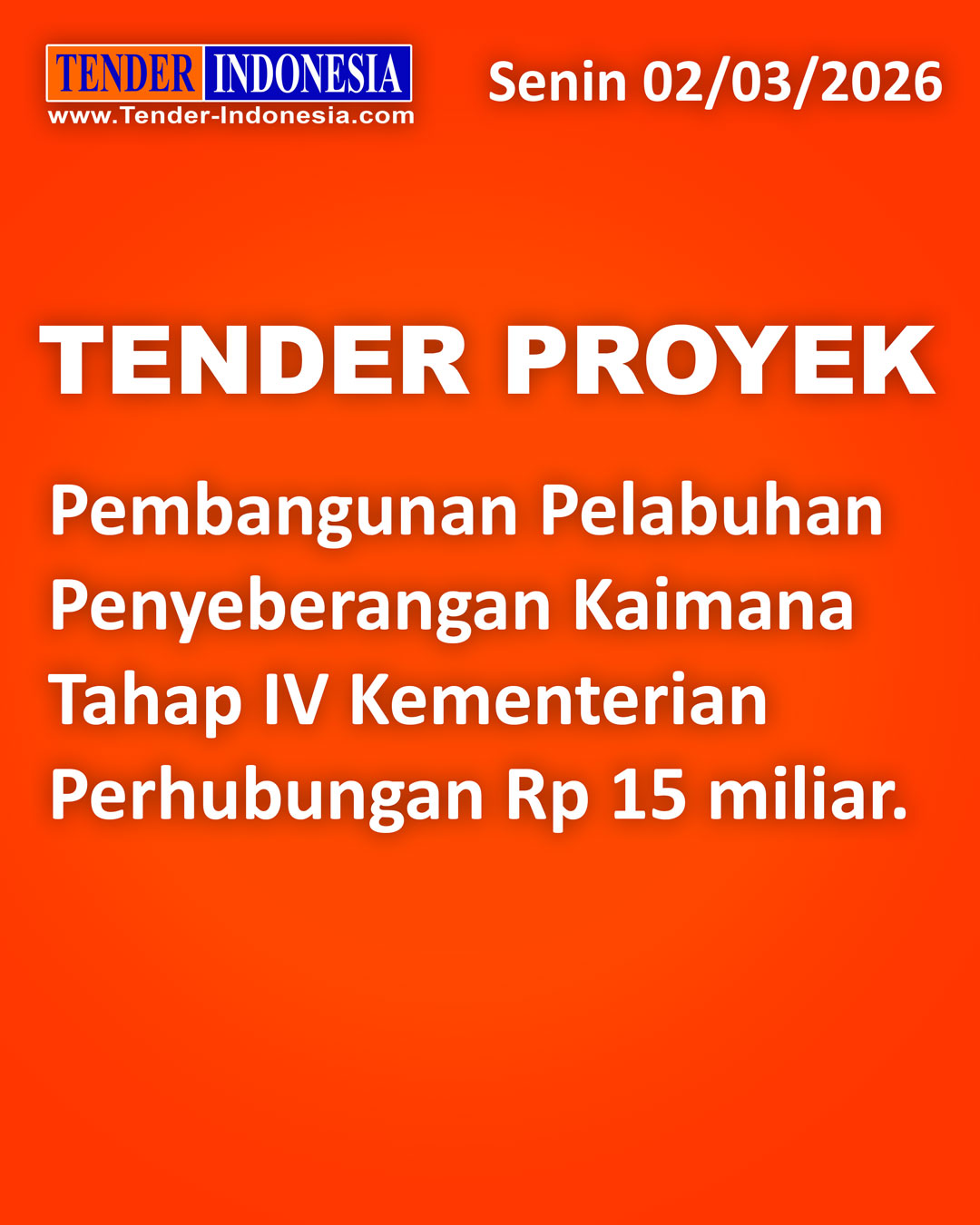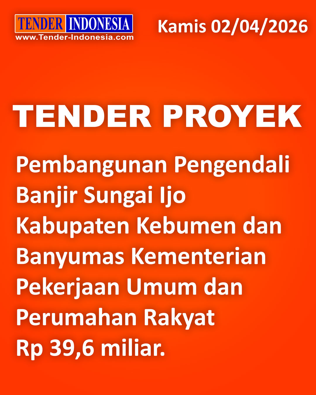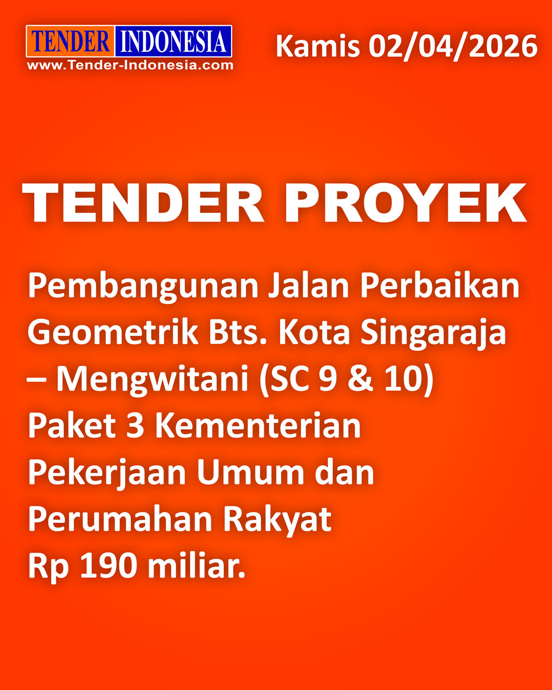 Kamis 16 April 2026, Info TENDER dan Info PROYEK : Tender Proyek Provinsi Jawa Barat berupa DPPT Ruas Jalan Lingkar KBP - Cipatat (Lingkar Padalarang) di Jawa Barat Rp 200 miliar *** Tender Proyek Provinsi Jawa Barat berupa KJSB Ruas Jalan Lingkar KBP - Cipatat (Lingkar Padalarang) di Jawa Barat Rp 200 miliar *** Tender Proyek Kementerian Perhubungan berupa Pembangunan Jalan Akses Stasiun Tanete Rilau dan Fasilitas Pendukung Lainnya di Sulawesi Selatan Rp 16,9 miliar *** Tender Proyek Kota Bontang berupa Pembangunan Sarana Olahraga Lapangan HOP 1 di Kalimantan Timur Rp 17,5 miliar *** Selain berdasarkan kategori jenis proyek, maka silahkan para member untuk mensetting fasilitas ROBOT TENDER untuk lebih memudahkan proyek yang mendatangi anda *** Untuk keterangan lanjut dapat hubungi 021-6247372 atau WA 0813 1576 9018 (TENDER INDONESIA www.Tender-Indonesia.com)